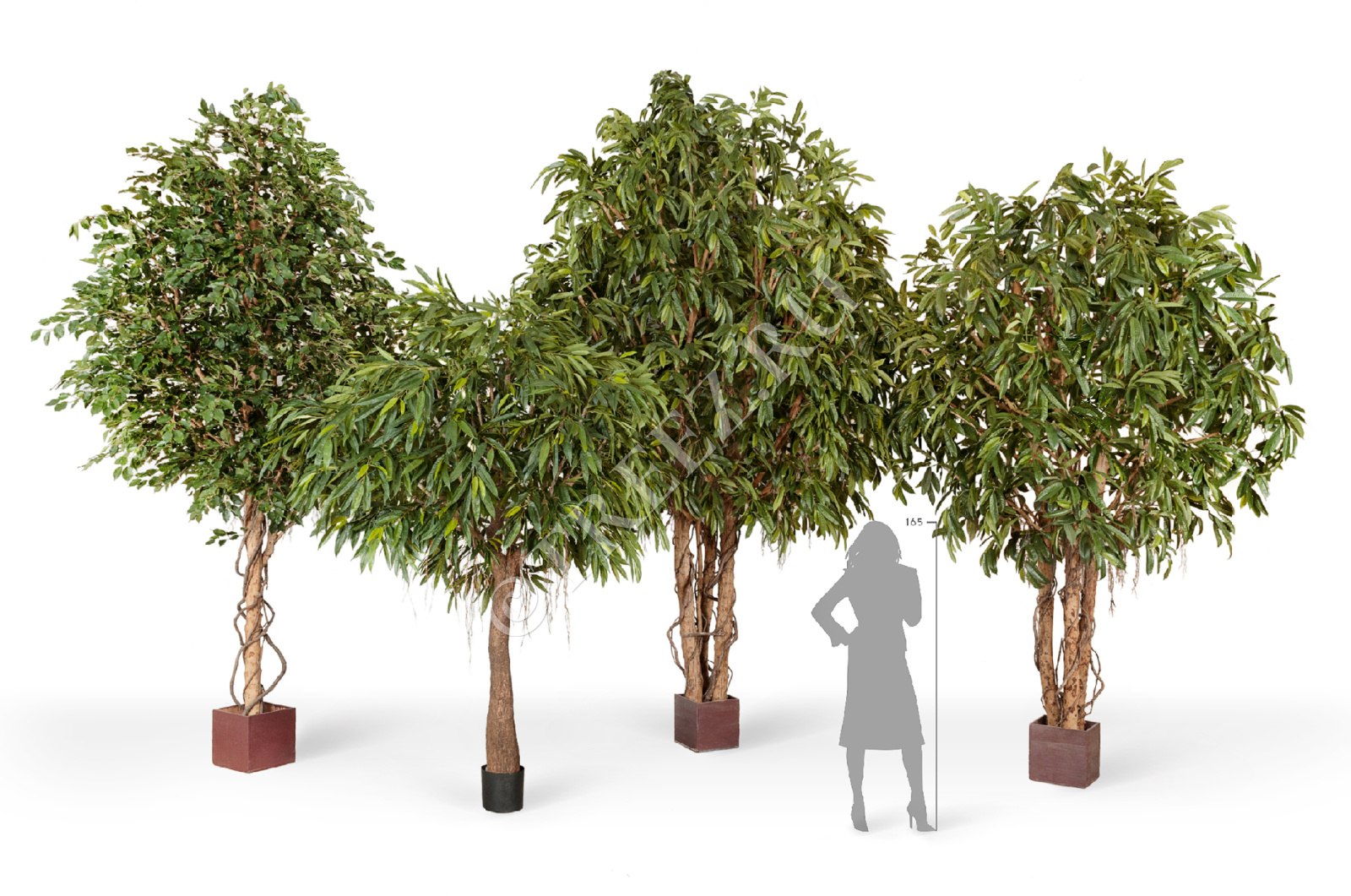 Размеры: высота вместе с кашпо - 420 см, диаметр кроны - 270 см, высота ствола от верха горшка до первой ветки - 110 см, диаметр стволов от 8 до 13 см, ширина расположения стволов 40-45 см.