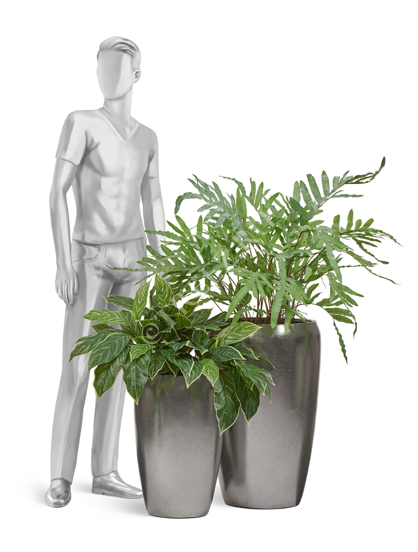 Сет № 125 - Композиция с папоротником и аглаонемой в серебряных кашпо Treez Effectory Metal